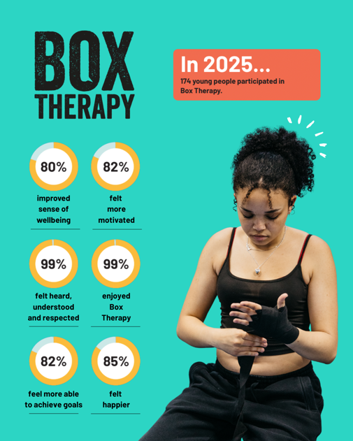 We rose to the challenge. By the end of 2025 we had reached 10,609 people. We supported 2,587 young people ourselves and we have trained boxing clubs and other locally trusted organisations to support 8,022 young people.