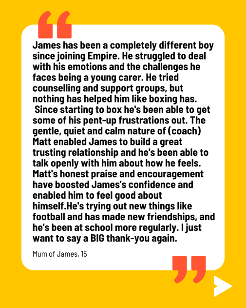 An example of one of these young people is James, 15, and his mum, when the journey to Empire came at a time when things felt uncertain. What followed was more than just sessions in a gym, it was consistency, belief and the right support at the right time.